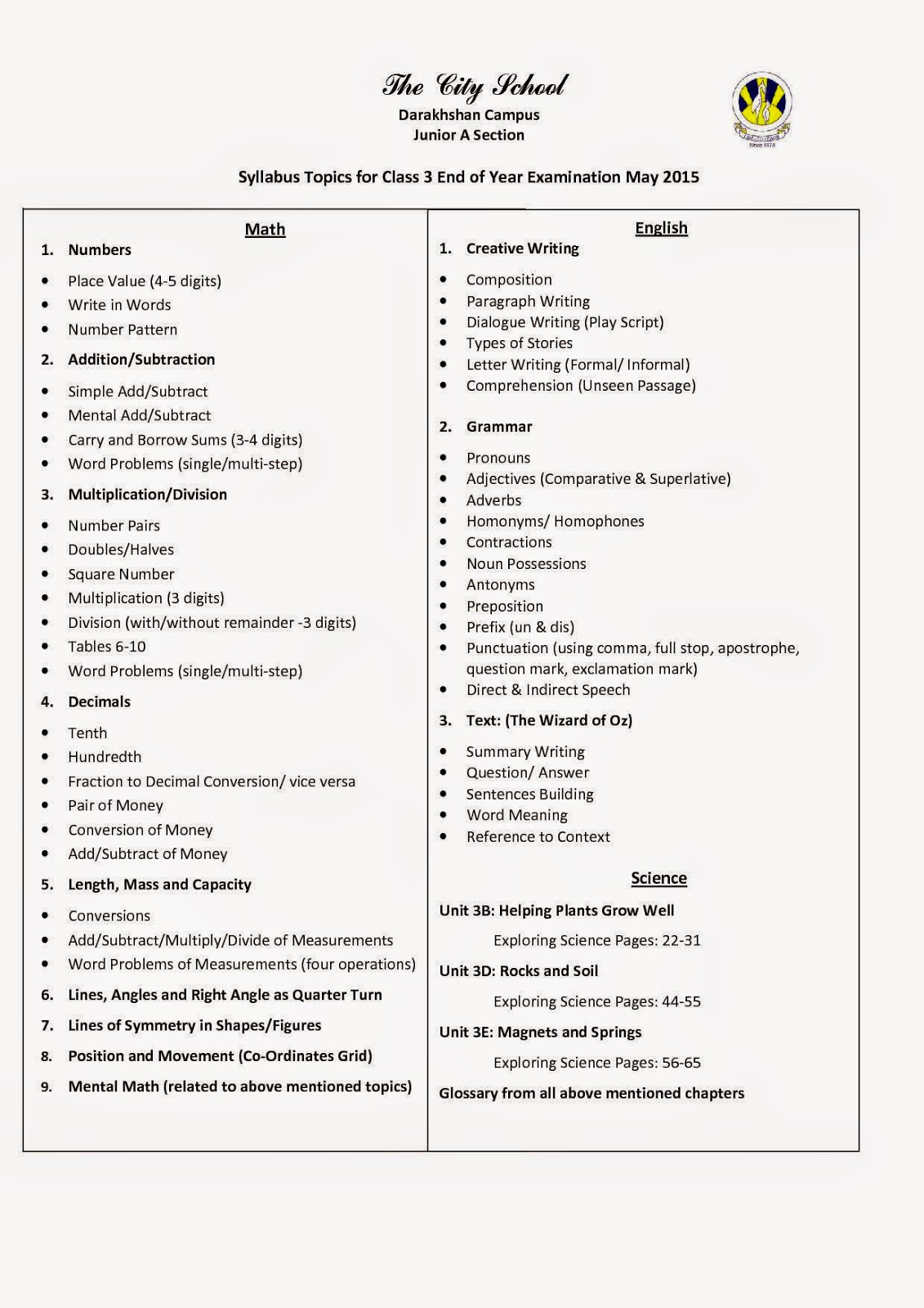 The City School Syllabus Topics for Class 3 & 4 End of Year